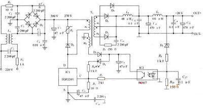 該開關電源的規劃方針是安穩20 V輸出,輸出電流0~2 A可變,用于音響系統。為了突出降低電磁噪聲的處理技能,簡化電路,用單片開關電源芯片TOP224Y進行規劃。TOP224Y內部已包含了PWM調制所需的所有電路以及鼓勵管輸出,由它鼓勵變壓器,開關頻率為100 kHz,內部MOS鼓勵管的耐壓為700 V,輸出功率小于45 W。電路如圖1所示,該電路能夠獲得更大的輸出功率,只需更改部分器件。圖1中左邊的電路R1,L1,D1,C1至C7是慣例的共模濾波和整流電路,獲取約300 V的直流電壓供DC-DC改換電路運用;最右邊電路L5,C11等是一般的LC濾波電路;IC2,D8,R9,R10組成電壓反應電路,構成閉環結構,安穩電源輸出電壓;中間部分是DC-DC改換器,降噪聲的關鍵是對這一部分的電路進行適當處理。